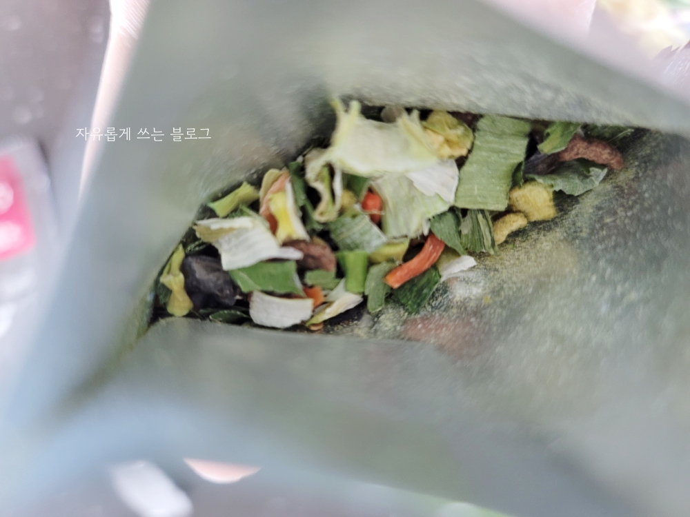 건더기는 이렇게 생겼어요. 건조된 파와 당근, 목이버섯 등이 들어가 있습니다.