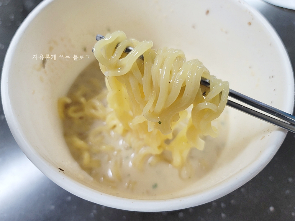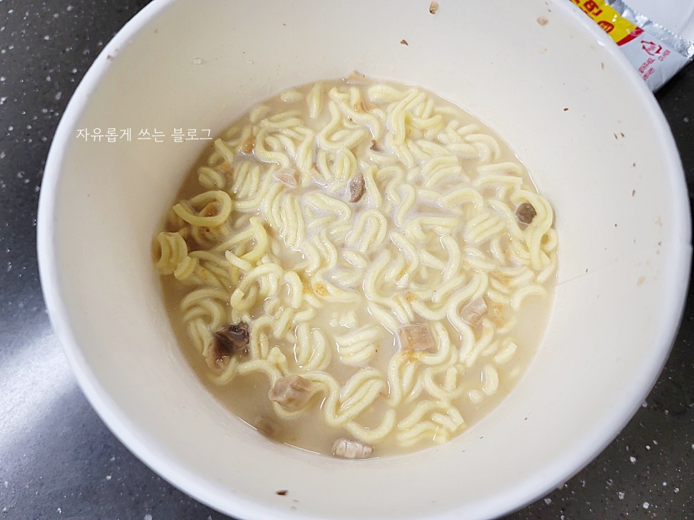 뜨거운 물을 붓고 전자레인지에 돌리는 방식이라 면이 퍼져서 식감이 흐물거리면 어쩌나 걱정했는데..