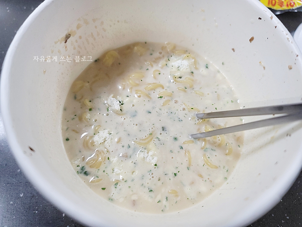전자레인지에 돌리기 전, 최대한 분말스프가 잘 풀어지도록 잘 저어 주었어요.