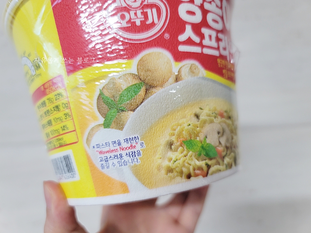 용기 한쪽을 보니 파스타 면을 재현한 'Waveless noodle'로 고급스러운 식감을 즐길 수 있다고 적혀 있네요.
