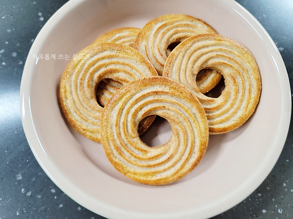 비스켓 5조각을 접시에 담아본 모습이에요. 모양이 꼭 버터링쿠키같은 느낌이죠?ㅎㅎ