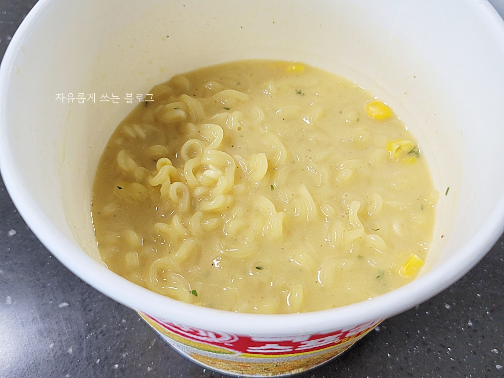 그리고 골고루 잘 저어주기만 하면, 고소한 옥수수 향이 솔솔 나는 옥수수스프 라면 완성이에요.