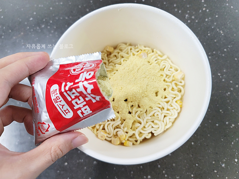 본격적으로 맛을 보기 위해, 먼저 분말스프를 면 위에 부어주었습니다.