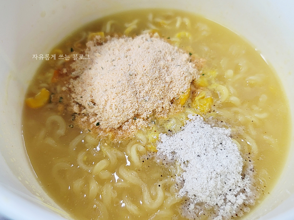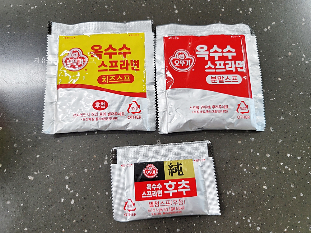 스프에 옥수수 맛을 내는 여러가지 분말(?)들이 들어갔고, 체다치즈분말이 들어간 것도 볼 수 있네요.
