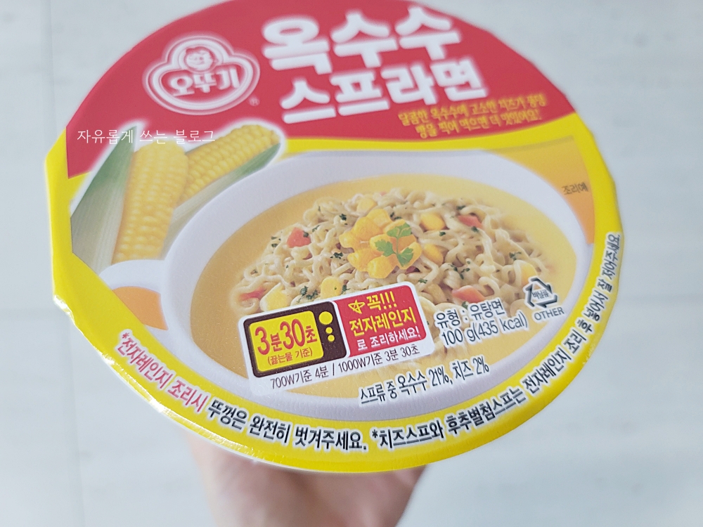 양송이 스프라면과 마찬가지로 오뚜기 옥수수스프 라면 역시 전자레인지로 조리해 먹는 컵라면입니다.