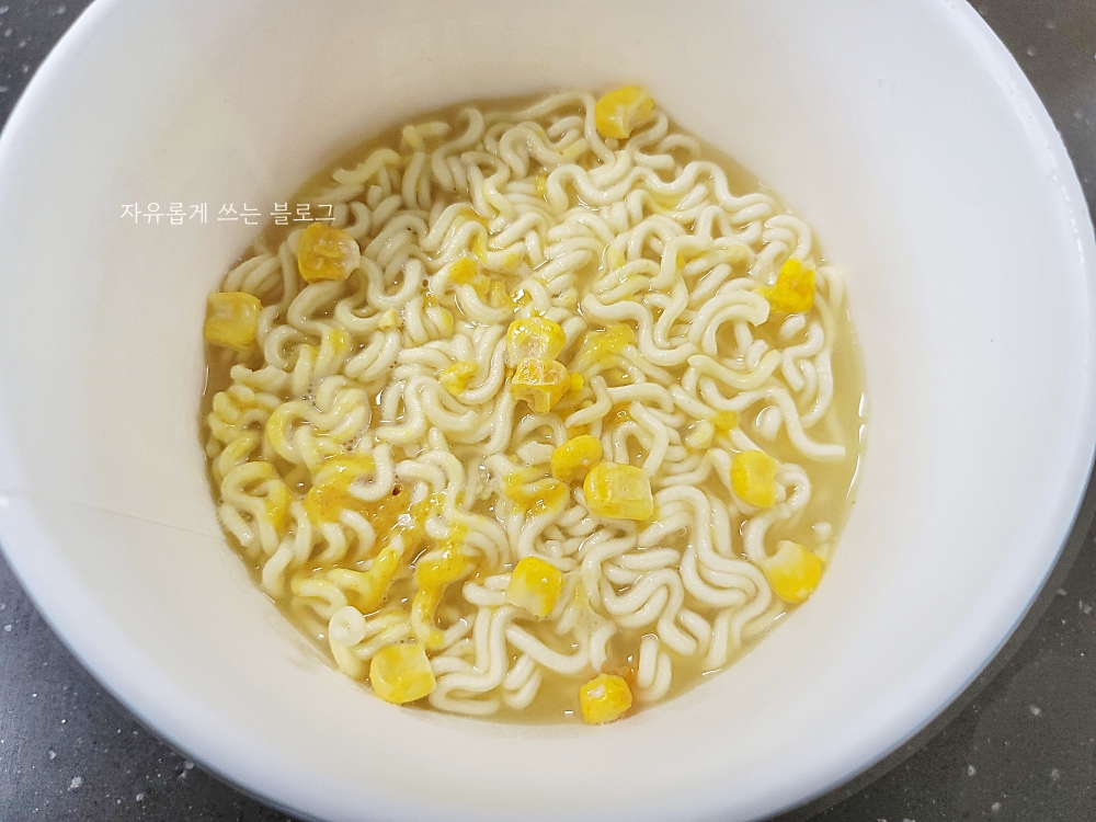 건더기도 함께 들어가 있는데요, 옥수수스프 라면답게 큼직한 옥수수 알갱이들이 보이네요.^^