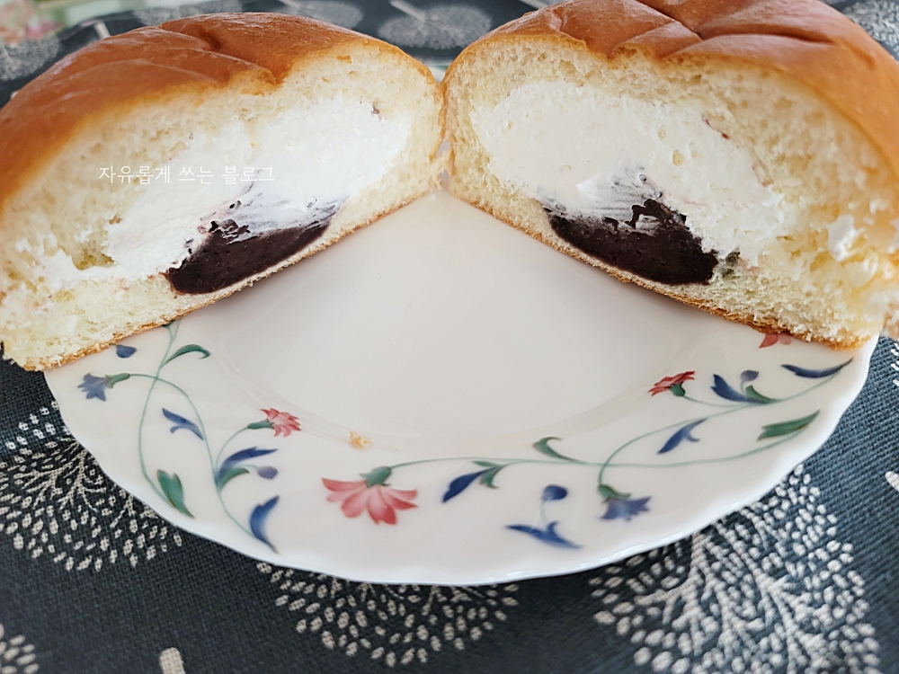 반으로 잘라본 모습입니다. 크림과 함께 단팥 앙금이 들어있는 모습이에요.