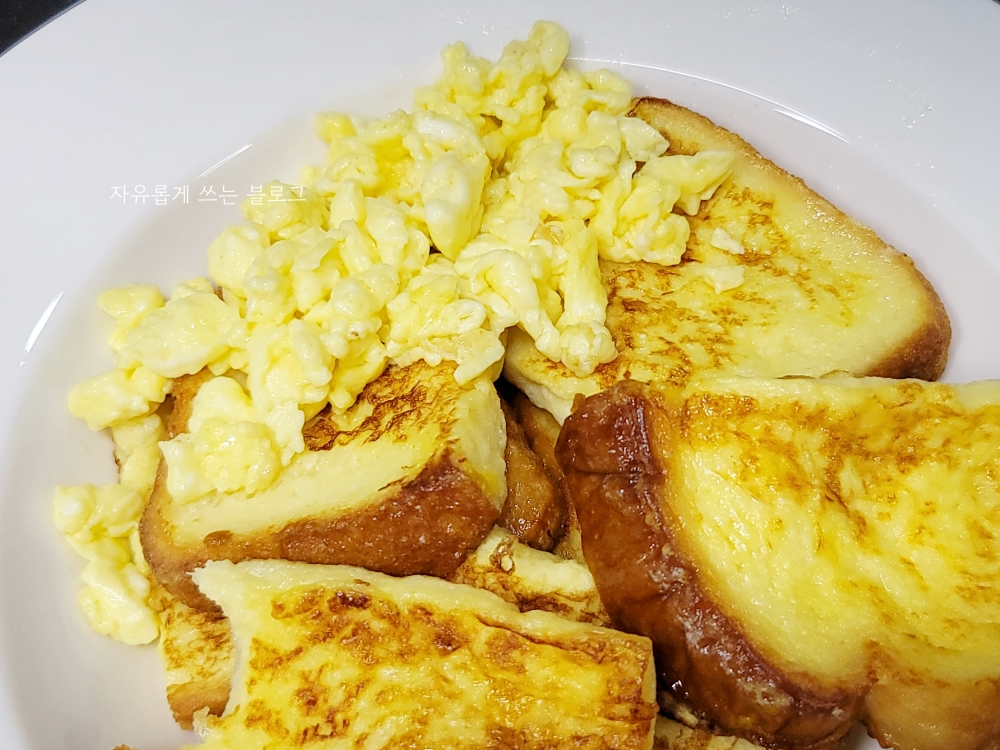 식빵 2장에 달걀물을 묻혀 만든 뒤, 달걀물이 남았길래 어떻게 할까 고민하다가 한번 스크램블을 해 보았어요.ㅎㅎ