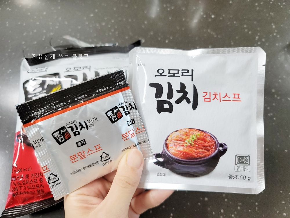 분말스프와 김치스프 2가지가 들어 있는데요, 김치스프에는 오모리 묵은지가 7% 함유되어 있다고 합니다.