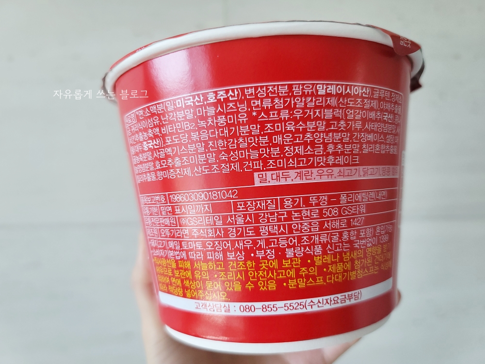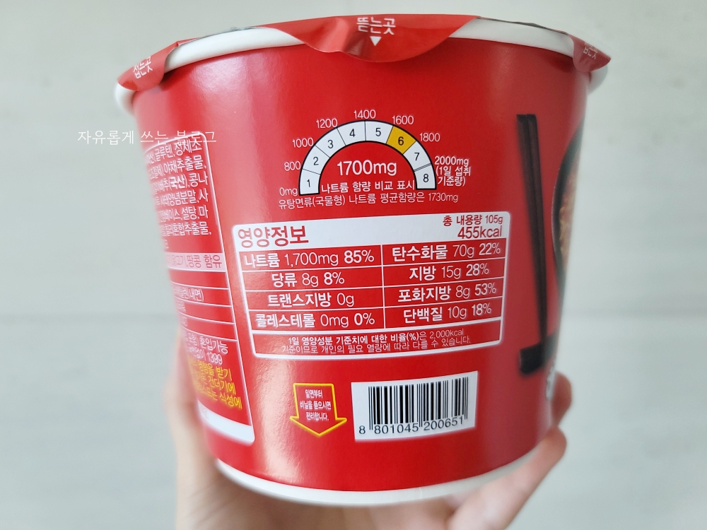 총 내용량 105g에 칼로리는 455kcal이네요. 나트륨 함량이 꽤 높은 편이라 국물은 일부러 다 먹지 않고 조금 남겼답니다.🙂