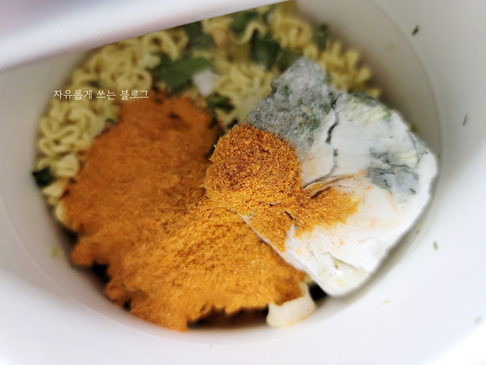 먼저 면 위에 분말스프, 우거지블럭을 넣고 끓는 물 370ml를 표시선까지 부은 후 뚜껑을 덮고 4분간 기다립니다.