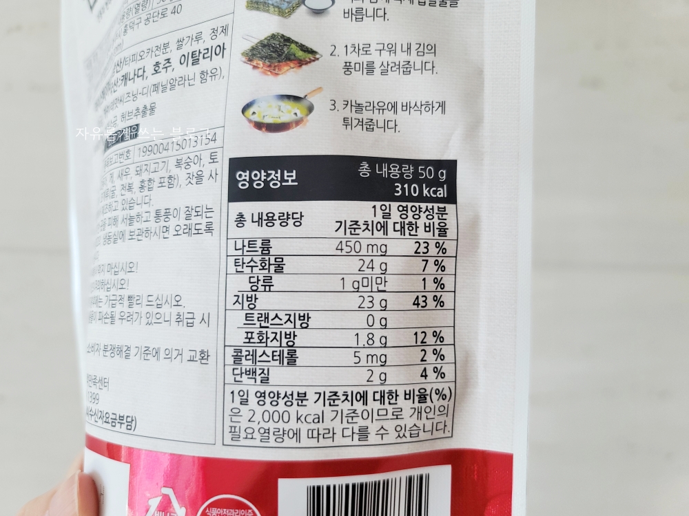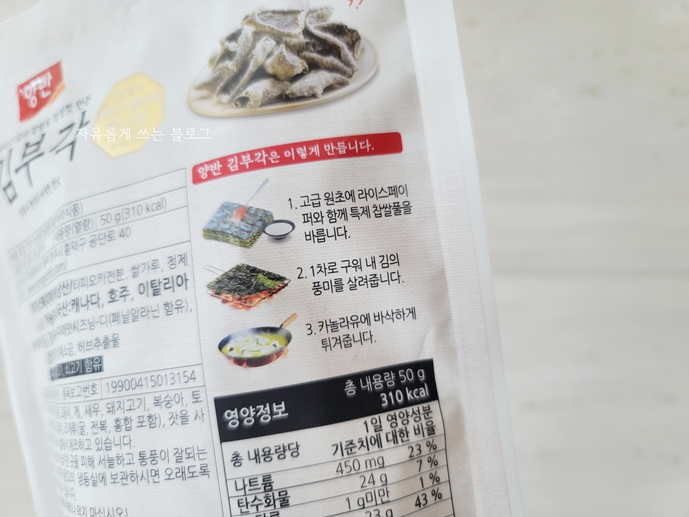 베트남산 라이스페이퍼가 사용되었고, 카놀라유, 김, 볶음파래맛씨즈닝, 찹쌀가루, 정제소금, 허브추출물 등이 들어갔다고 해요.