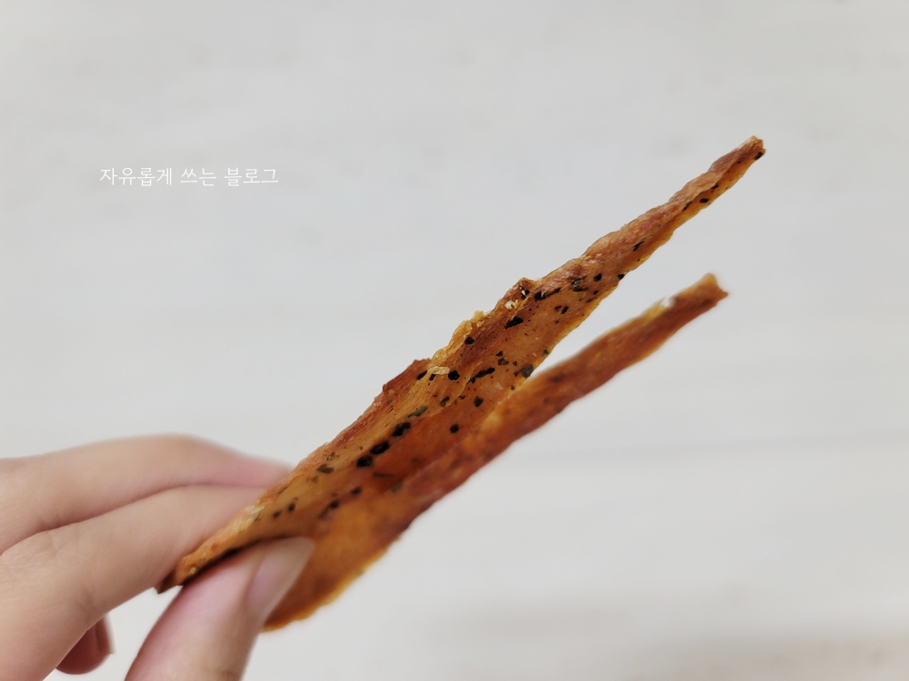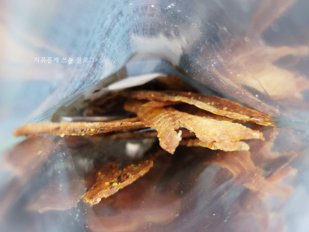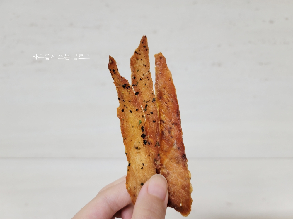 얇게 저며 구워낸 닭가슴살칩에 후추 시즈닝이 솔솔 뿌려져있는 비주얼이에요.