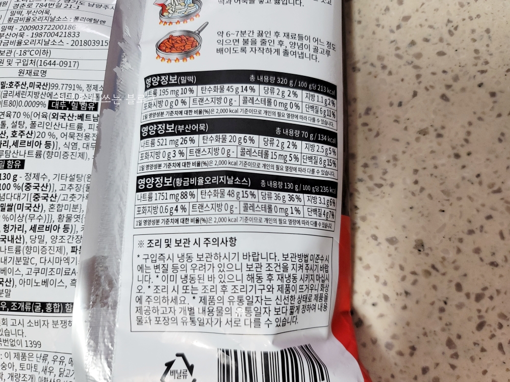 원재료명을 보니 소스에는 설탕, 고춧가루, 고추장, 물엿 등등 뭔가 다양한 재료들이 들어간 듯 합니다.ㅎㅎ