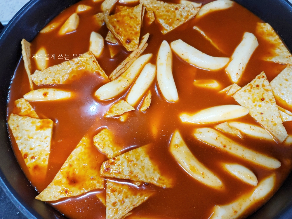 팬에 분량의 물과 해동한 떡, 어묵, 소스를 전부 넣어 끓여주었습니다.