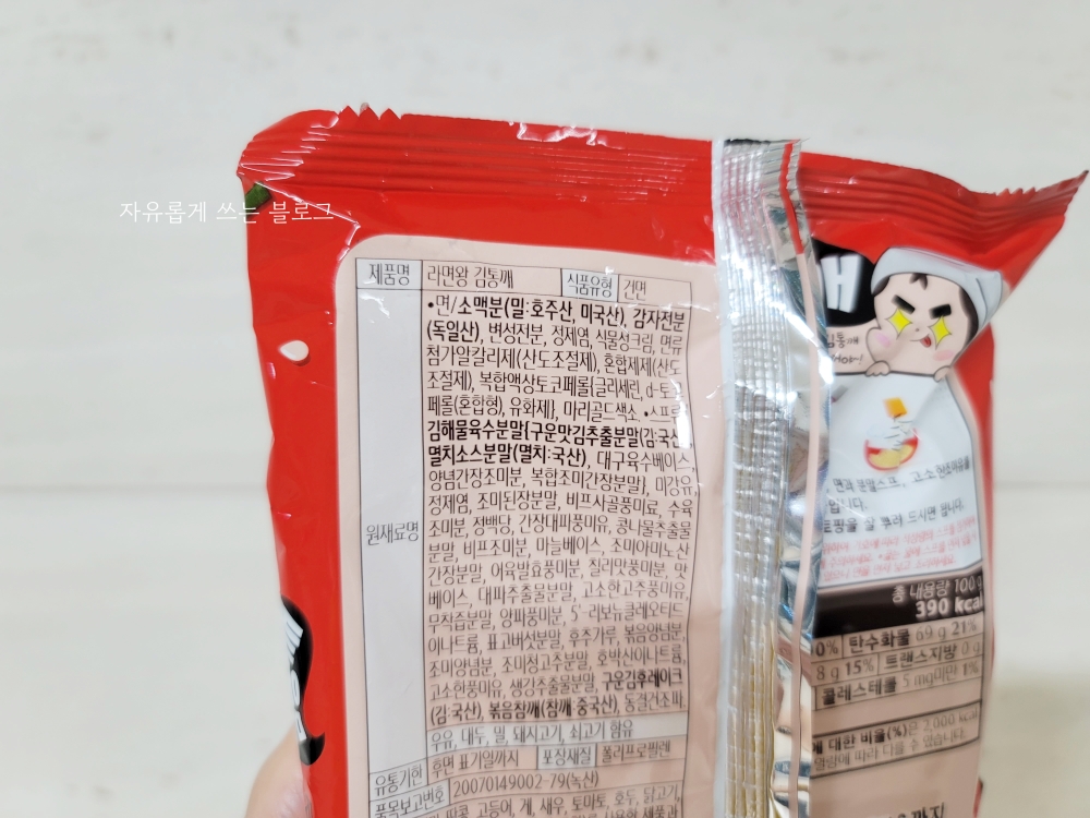 라면왕 김통깨는 총 내용량 100g에 칼로리는 390kcal입니다.