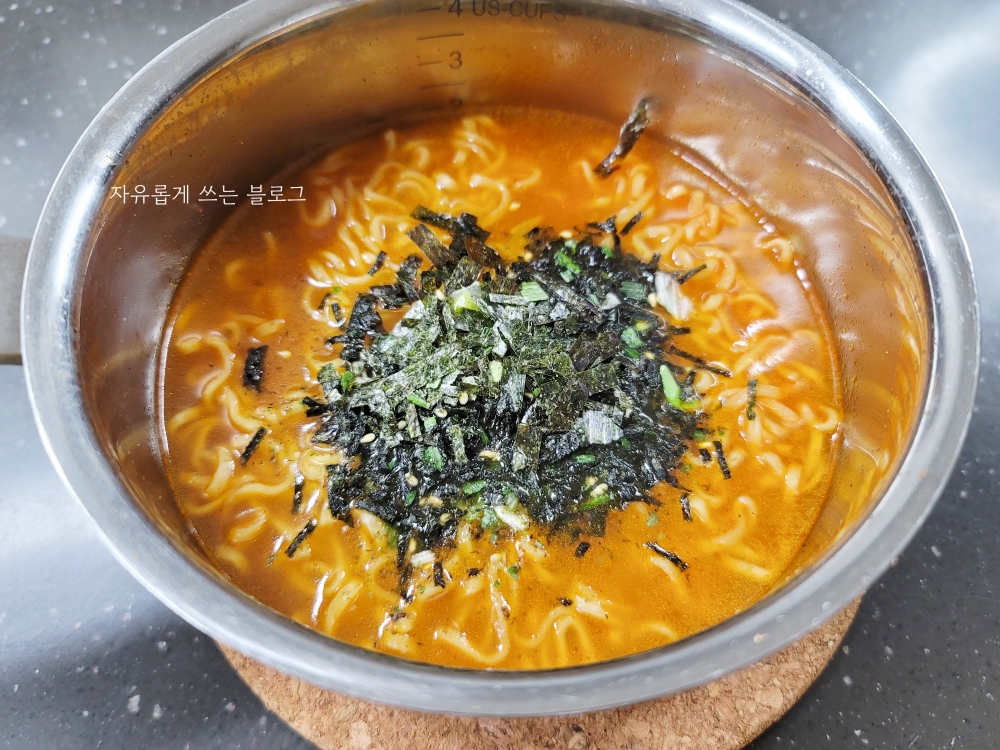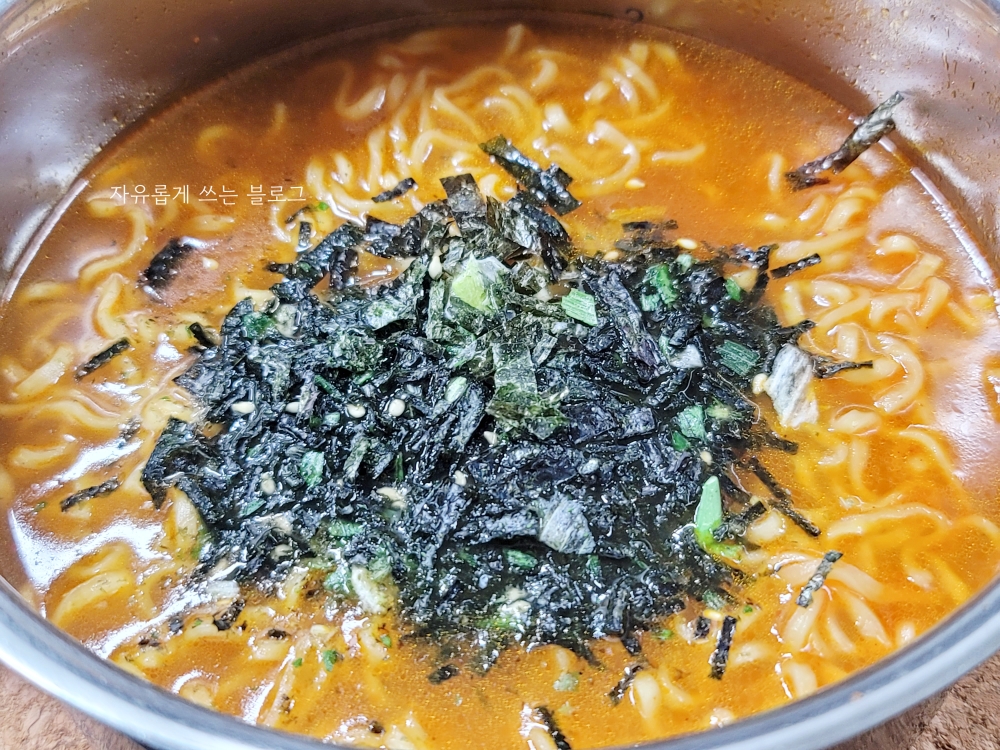 잘 끓여진 라면에 후첨토핑을 뿌려주기만 하면 완성이에요. :)