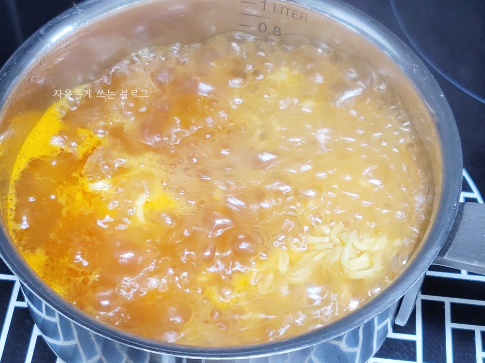 조리방법에 나와 있던 대로, 끓는 물 500ml에 면과 분말스프, 조미유를 함께 넣고 끓여주었어요.