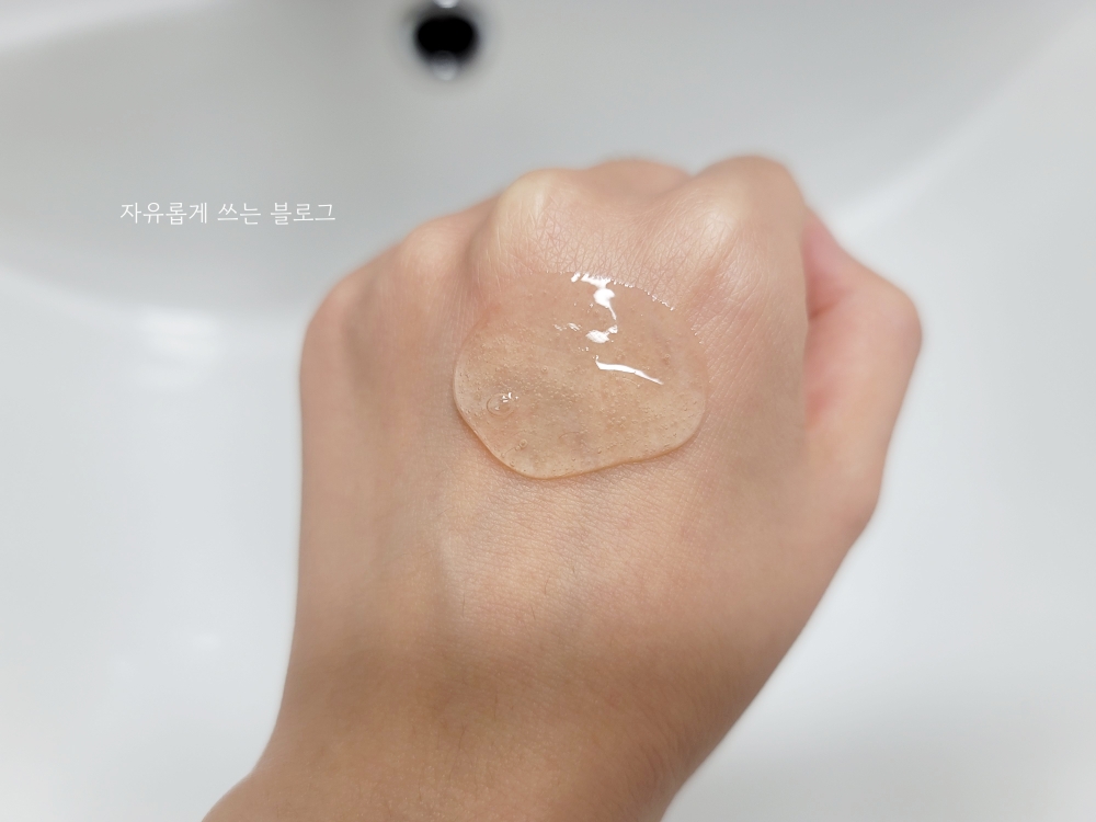 손등에 약간 덜어본 모습이에요. 맑고 투명한 젤리 같은 느낌의 제형입니다.
