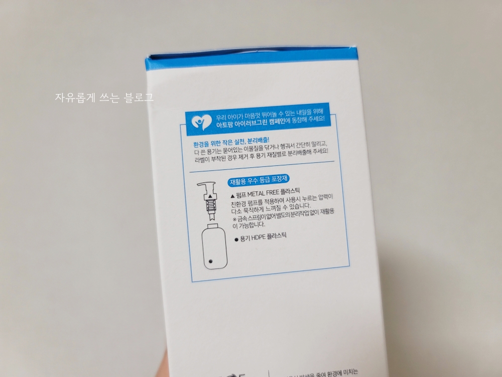 용기가 펌핑 평식으로 되어있는데, 금속 스프링이 들어있지 않은 메탈 프리 펌프라 별도의 분리작업 없이 재활용이 가능하다고 해요.