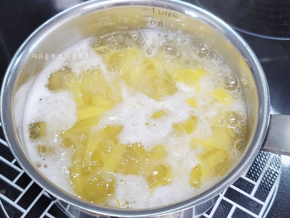조리법에 적혀 있던 대로 물 600ml를 끓인 뒤, 면을 넣어 3분 30초 정도 익혀주었습니다.