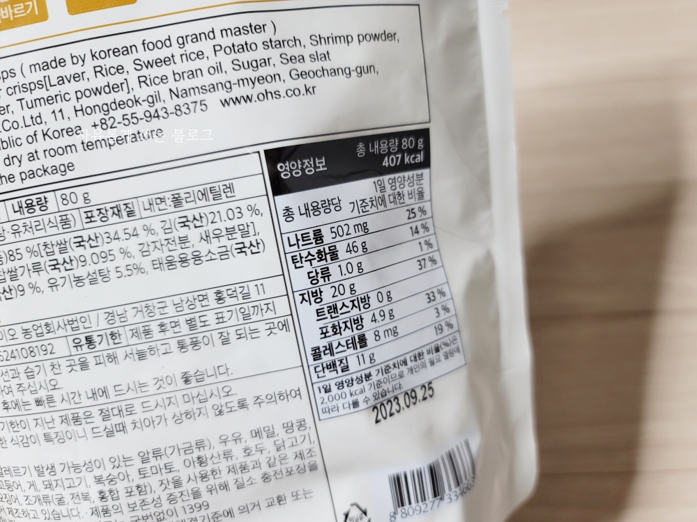원재료명이 있는 부분도 찍어 보았습니다. 찹쌀, 김, 멥쌀, 찹쌀가루, 감자전분, 새우분말이 사용되었고,