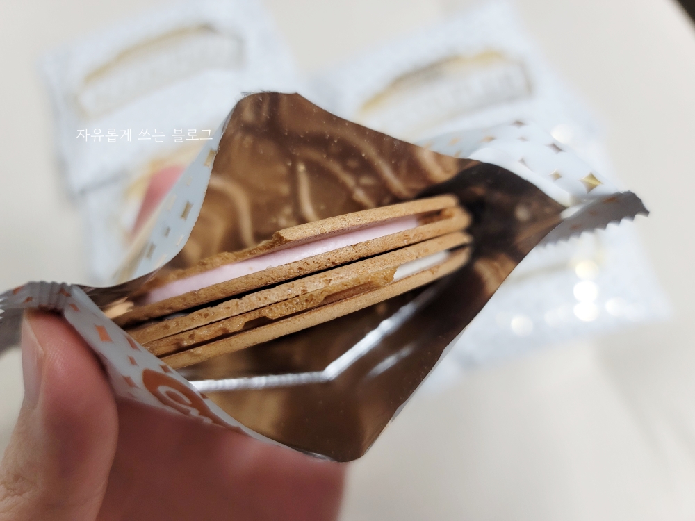 과자를 뜯어보면 한 봉에 화이트 크림 샌드와 딸기 크림 샌드가 하나씩 들어 있는데,