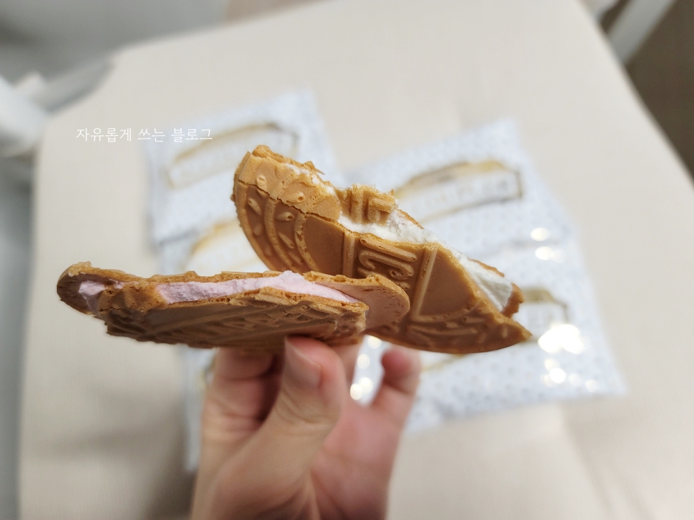 내부 크림을 보여드리기 위해 과자 부분만 약간 먹은 뒤 찍어본 사진이에요.ㅎㅎ