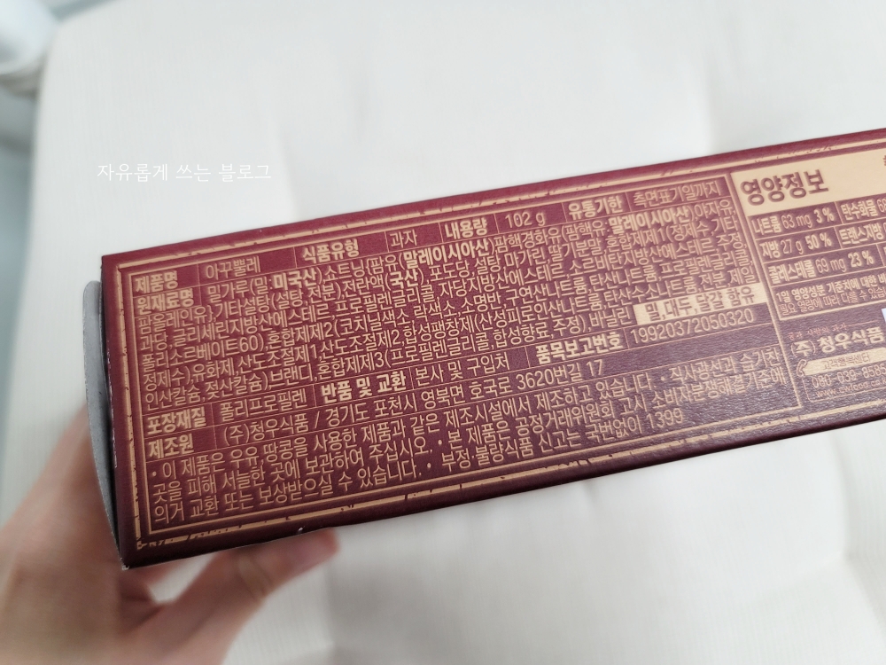박스 한 쪽에는 영어로, 다른 한 쪽에는 한글로 적혀 있네요. 유러피안 프리미엄 쿠키라는 문구도 보입니다.