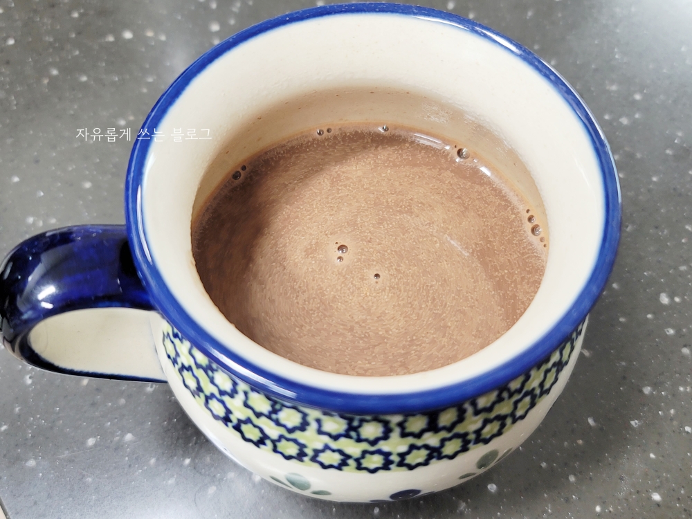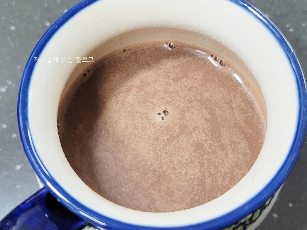 맛을 보기 위해 스틱 1개를 컵에 담아보았습니다. 입자는 고운 편이고, 코코아 향이 솔솔 나더라고요.