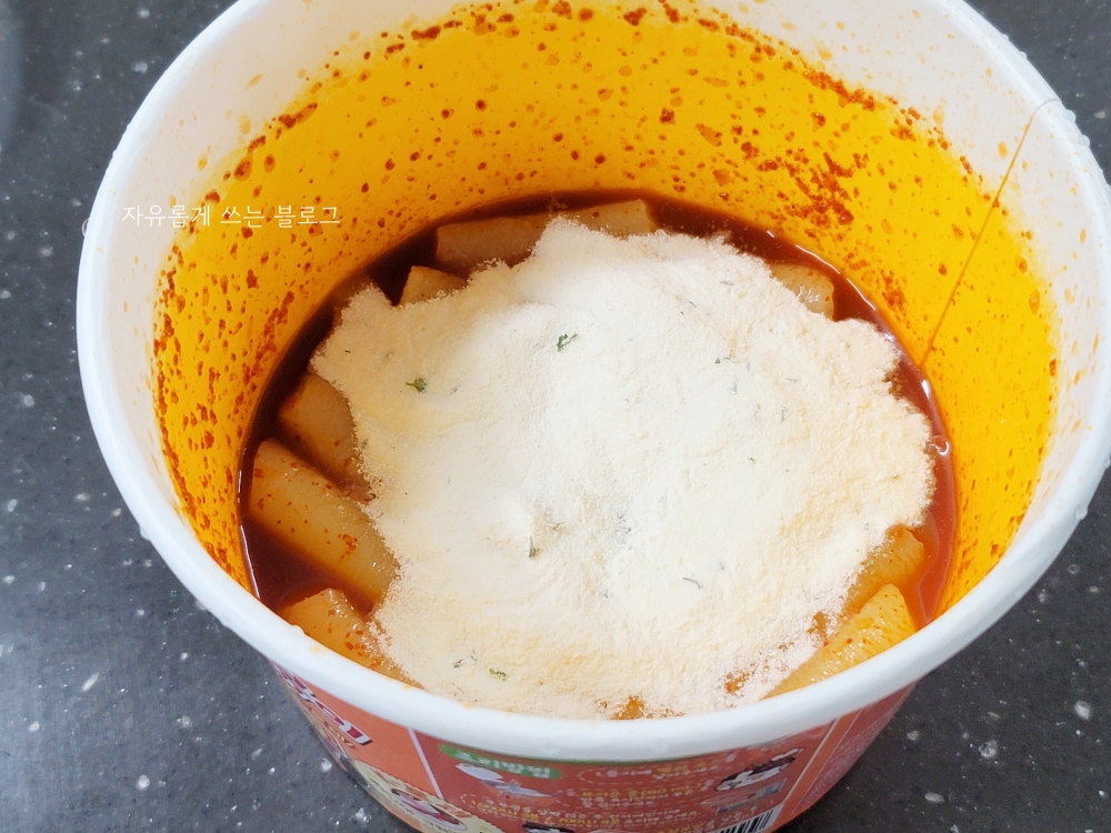 일단 조리법에 적힌 대로, 용기에 떡과 소스를 넣은 뒤 뜨거운 물을 안쪽 표시선까지 부어주었습니다. 그리고 최대한 잘 섞이도록 저어주었어요.