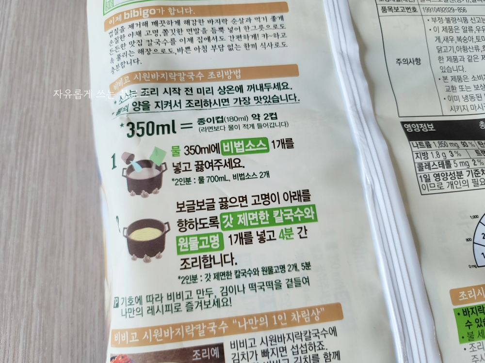 포장 뒷면에는 비비고 시원 바지락칼국수에 대한 설명도 적혀 있습니다.