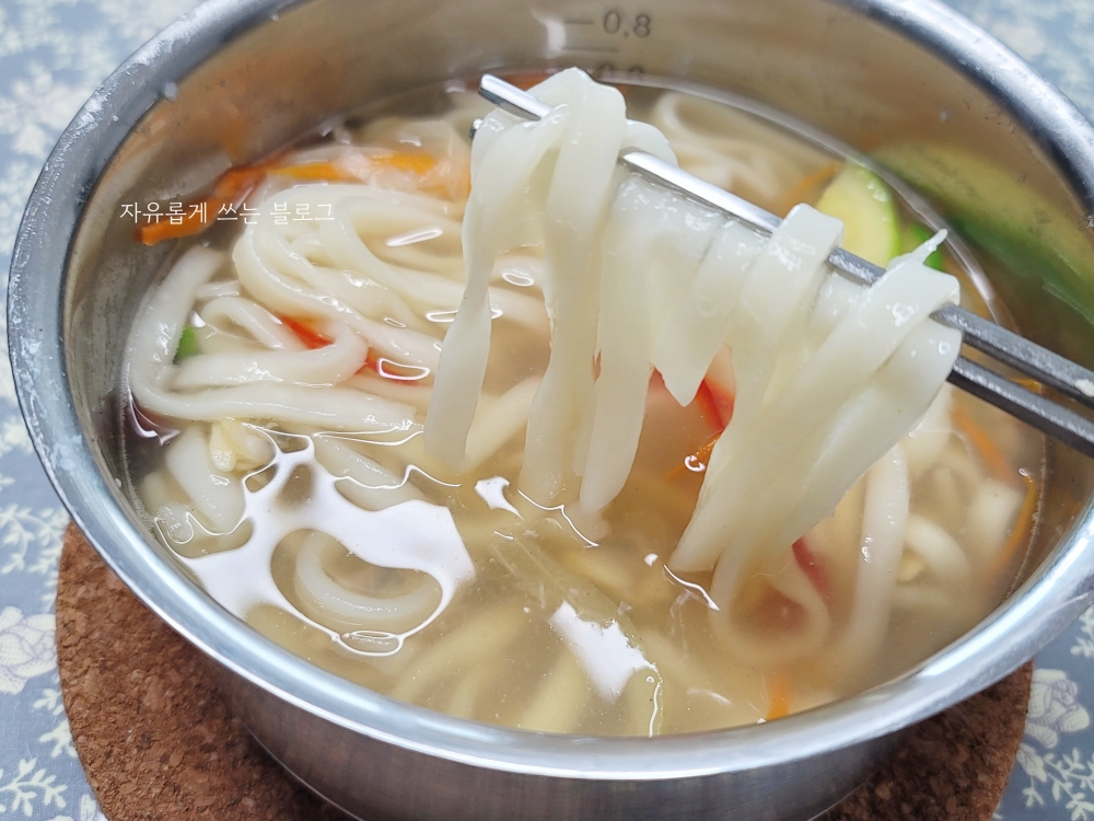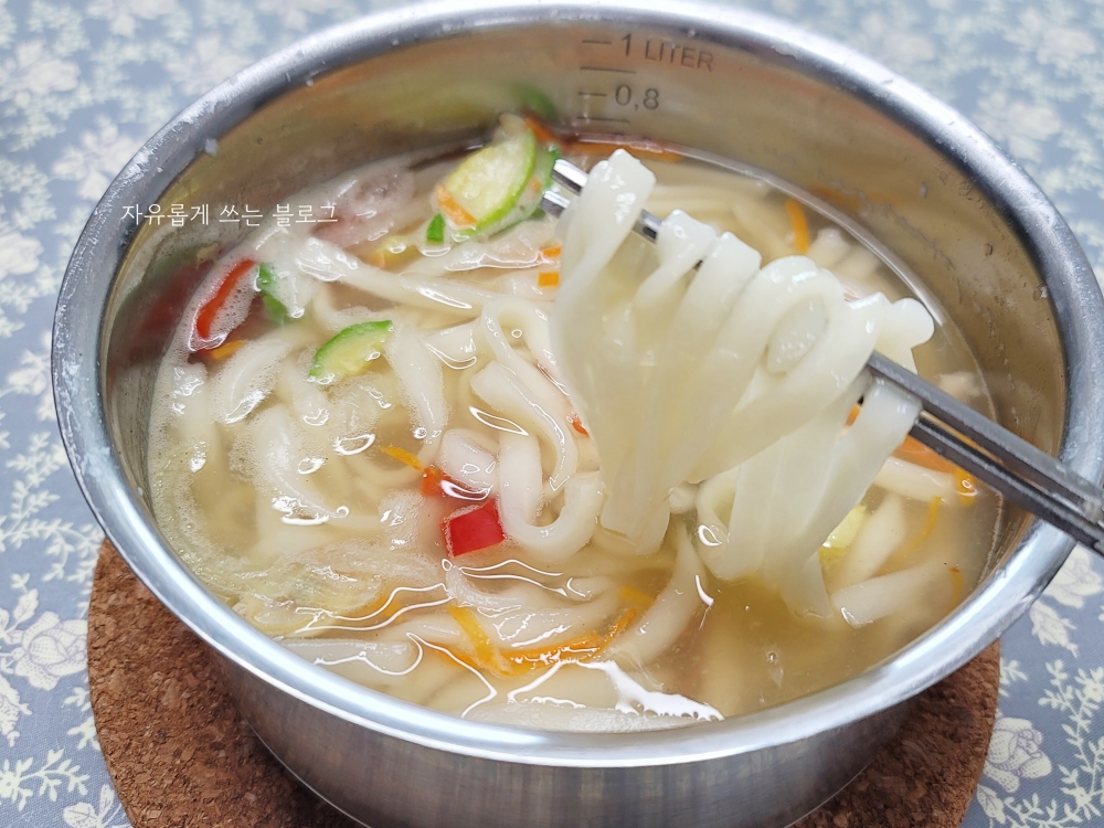 조리법대로 칼국수 1인분을 끓여본 모습이에요. 라면 끓이듯이 간편하게 끓일 수 있어서 정말 좋더라고요.👍