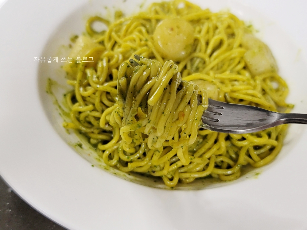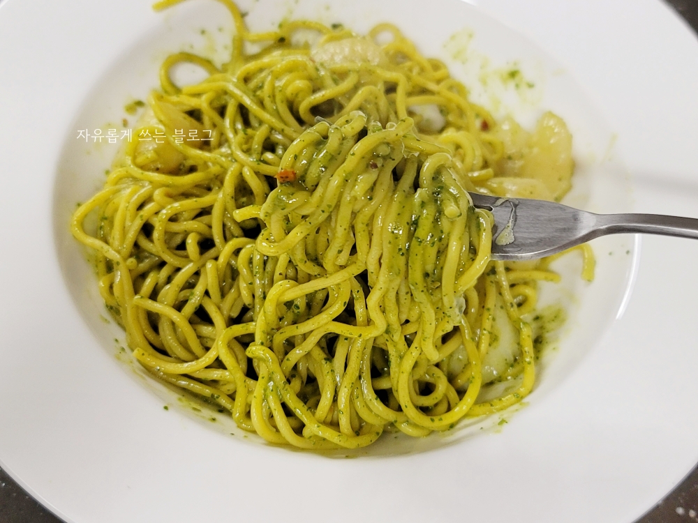 바질이 들어간 소스여서인지 초록빛이 도는 느낌으로 완성이 되었습니다. 비쥬얼도 나름 먹음직해서 고급 레스토랑에 온 분위기를 낼 수 있겠더라고요.ㅎㅎ