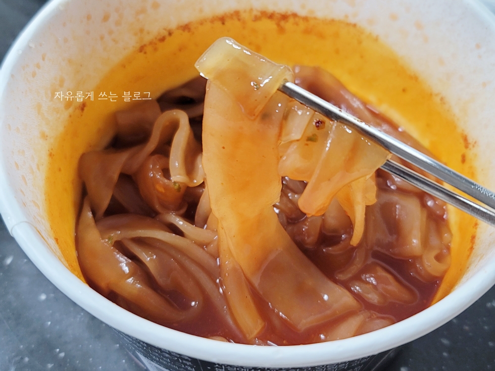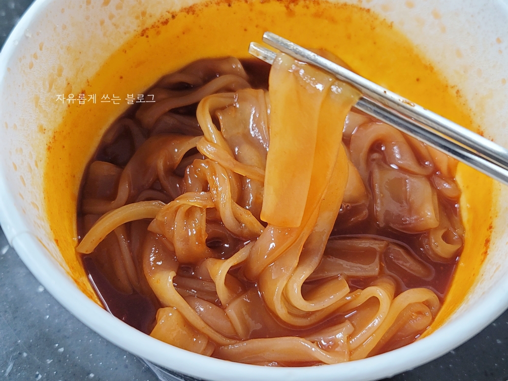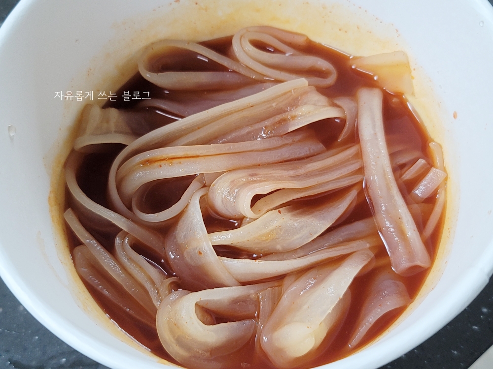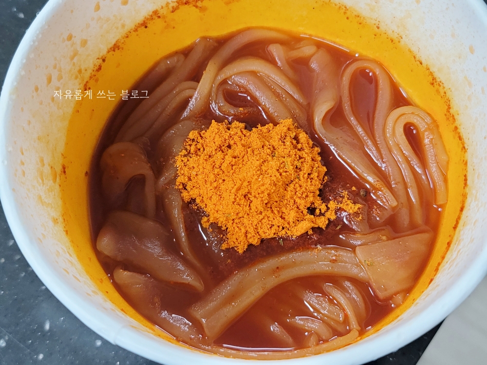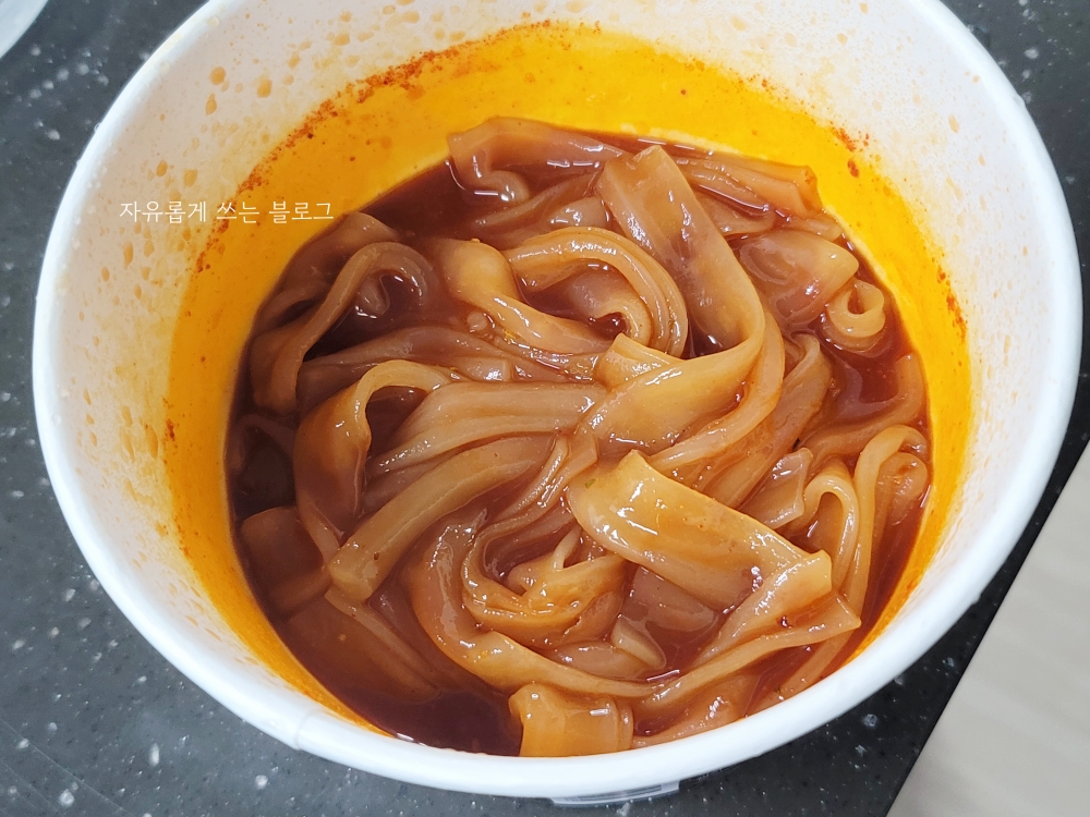 전자레인지 조리를 마친 뒤, 후첨 분말을 넣어 잘 섞어주면 먹을 준비 완료입니다.😄 먹기 전부터 매콤달콤한 냄새가 솔솔 나서 침이 막 고이더라고요.ㅋㅋ