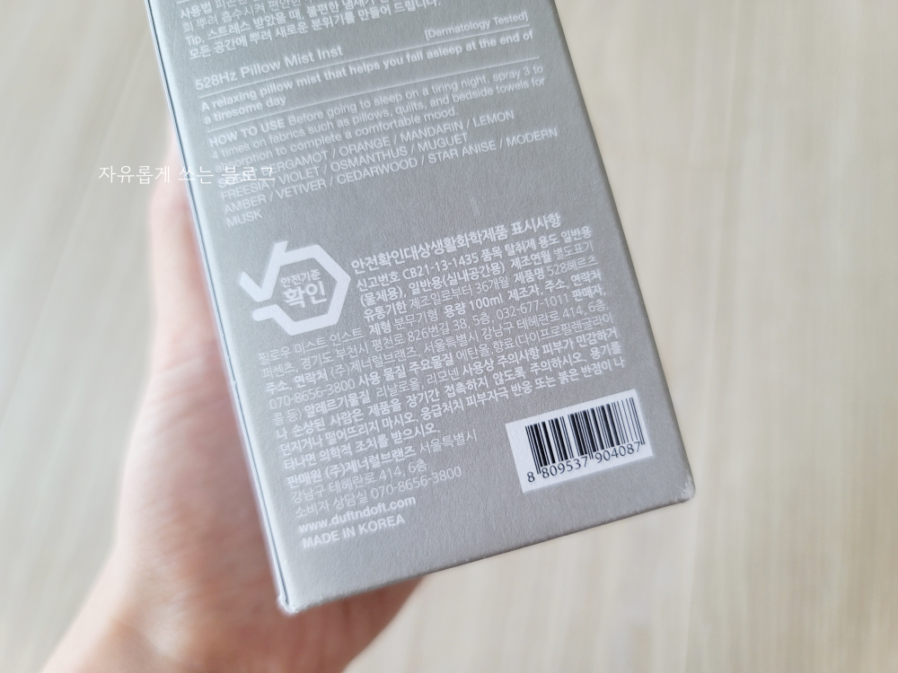 피부 저자극 테스트고 완료되었다고 하네요. 공간에 향기를 입힌다는 느낌으로, 베개, 침구류, 커튼, 쿠션 등 원하는 곳에 뿌려 사용하면 됩니다.