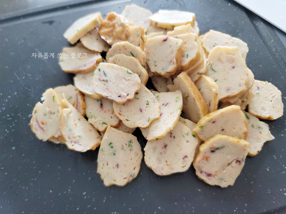 조리방법에 적혀 있는 대로 일단 어묵을 얇게 썰어주었습니다. 얇게 썰수록 국물 맛이 산다고 해서 최대한 얇게 썰었는데, 너무 앏게 썰었나 싶기도 하네요.ㅋㅋ