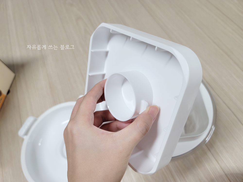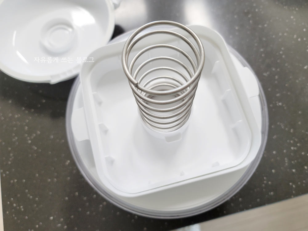 제품 뚜껑을 오픈하면 여러가지 구성품들이 보이는데요. 먼저 요 스프링은 유청이 더욱 잘 빠질 수 있도록 강하게 눌러주는 역할을 합니다.