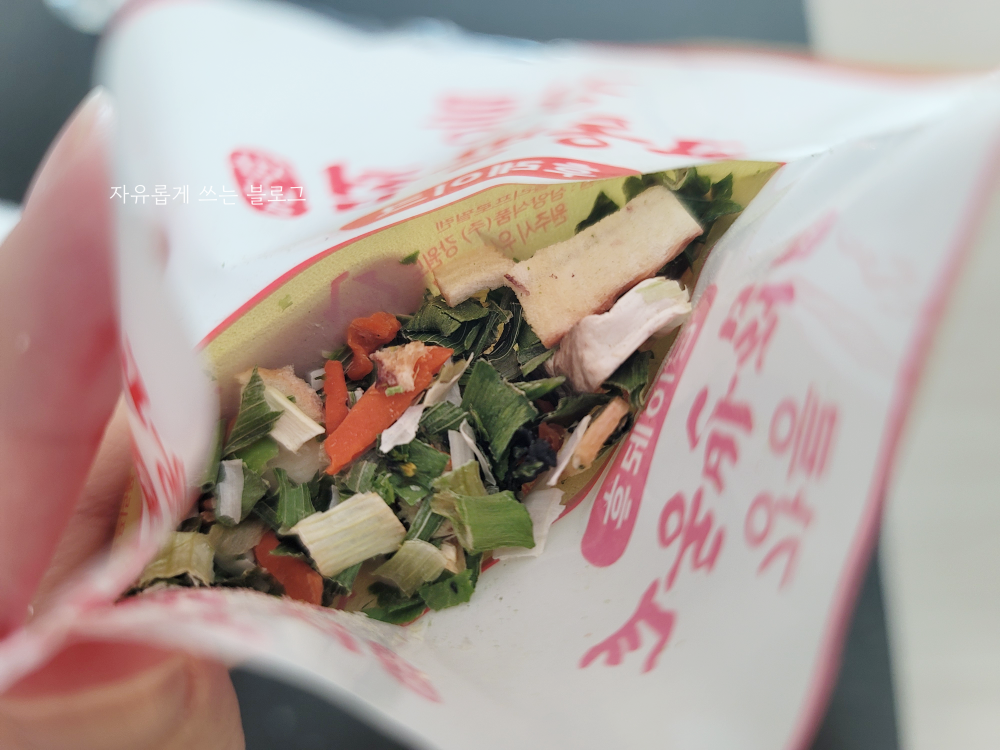 건더기도 나름 충실하게(?) 들어 있는 편입니다. 오징어 청경채, 대파, 당근, 동결건조 브로콜리 등이 들어있어요.
