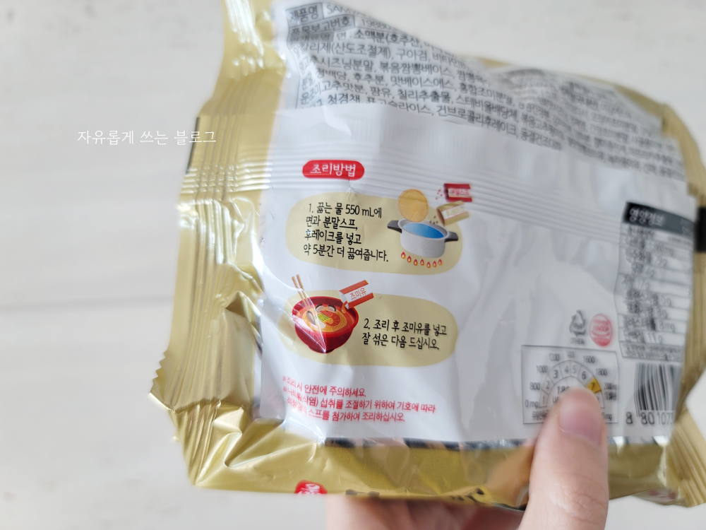 끓는 물 550ml에 면, 분말스프, 후레이크를 넣고 약 5분간 더 끓인 다음, 마지막에 조미유를 넣고 잘 섞어 먹으면 됩니다.