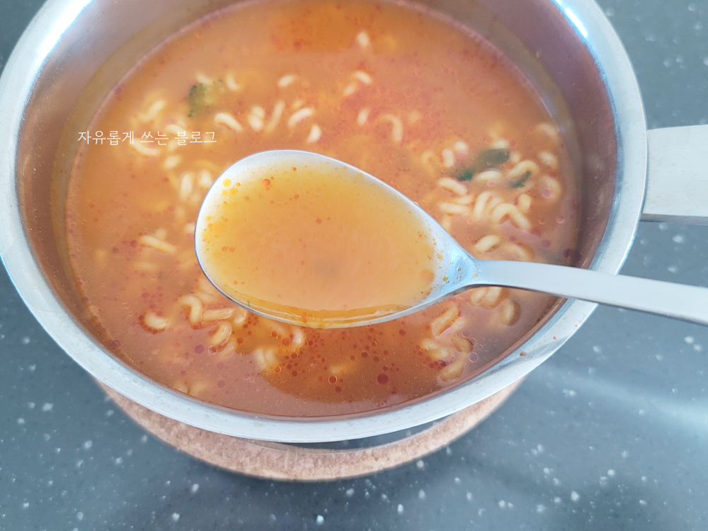 잘 섞은 다음 일단 국물부터 맛을 보았네요. 일단 국물 맛은 제 기준으로는 합격이었어요.ㅎㅎ