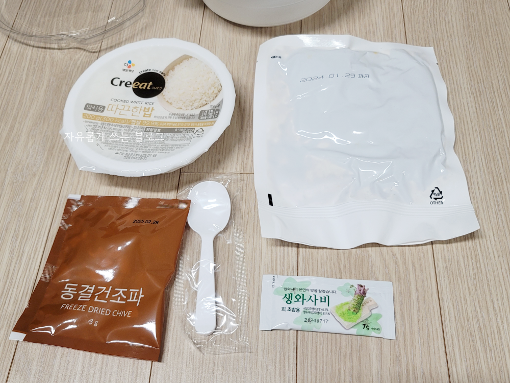 크레잇 따끈한밥, 족발덮밥소스, 동결건조 파, 생와사비가 들어있고 숟가락도 함께 들어있습니다.