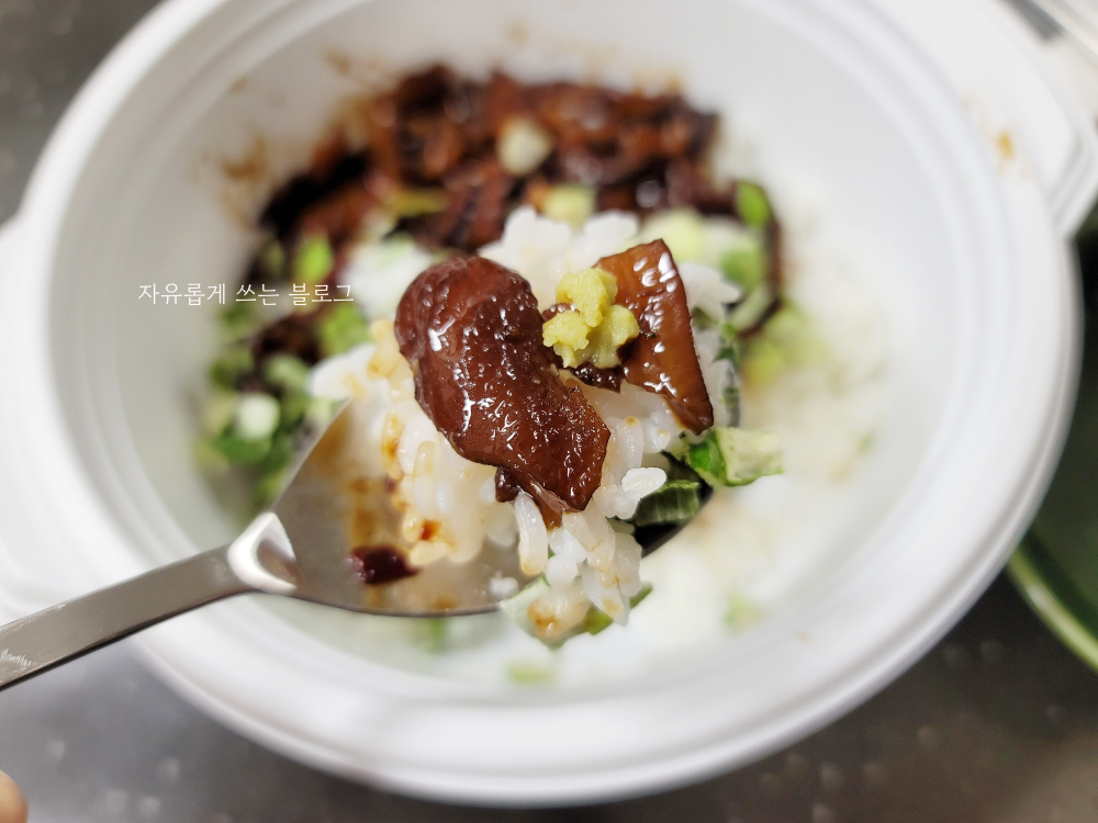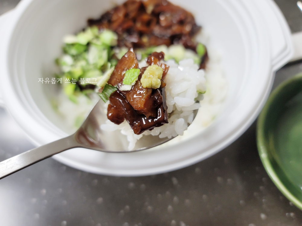 일단 즉석밥을 1분 30초만 데우고, 용기에 담은 다음, 간장족발덮밥 소스와 동결건조 대파를 올려주었습니다.