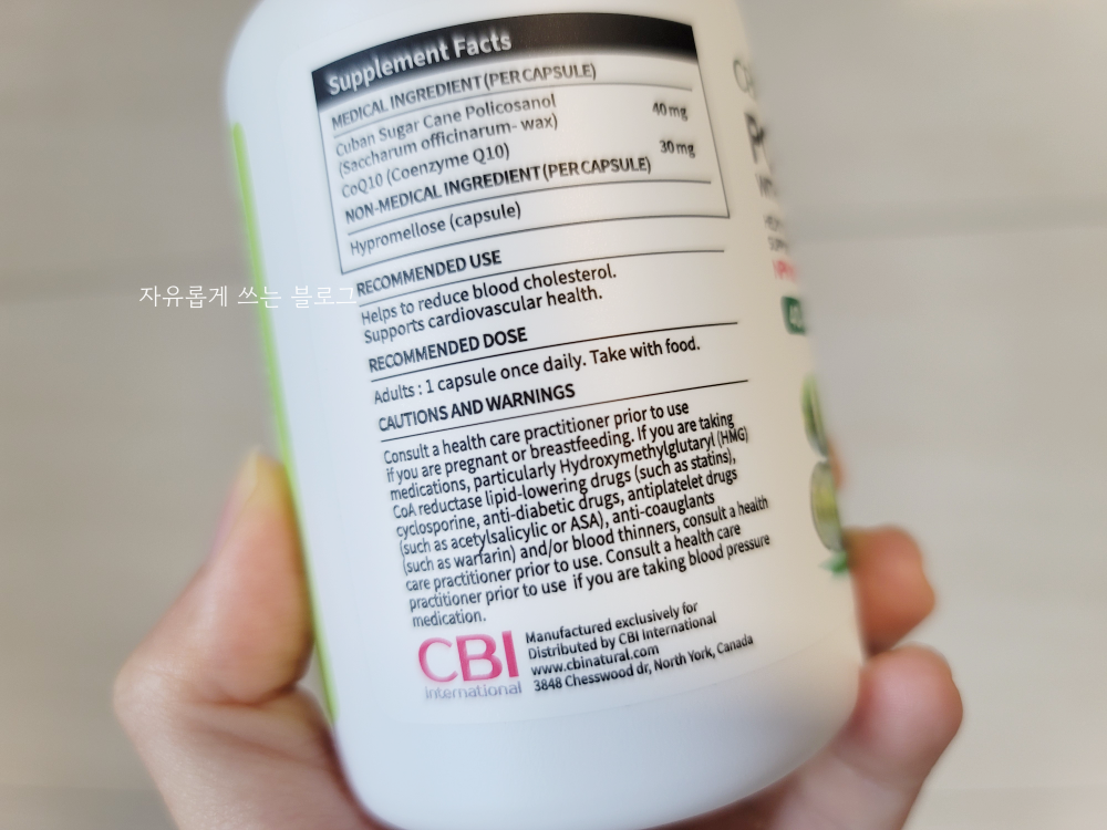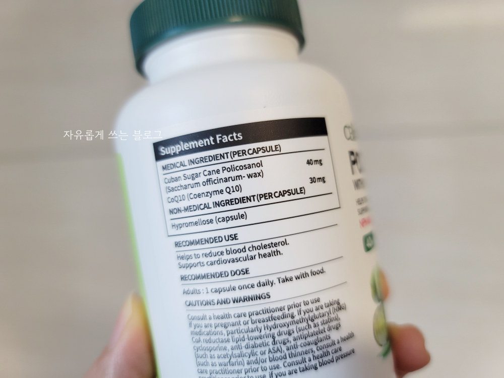 캐나다에서 생산된 제품인데, 원료는 쿠바산 폴리코사놀을 사용했다고 해요. 코엔자임Q10도 함께 들어있어 혈관 관리에 도움을 준다고 합니다.