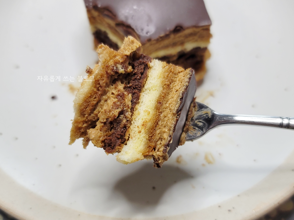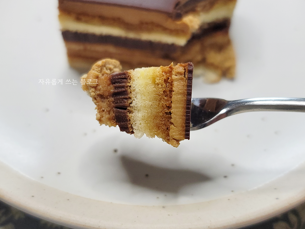 소프트 비스킷, 커피 크림, 아몬드 비스킷, 초콜릿 가나쉬, 소프트 비스킷, 코코아 아이싱 순서로 층층이 쌓았다고 해요.😊