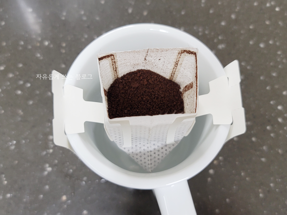 맛을 보기 위해 탐앤탐스 디카페인 과테말라 핸드드립 커피 1개를 꺼내 컵에 걸어주었습니다.