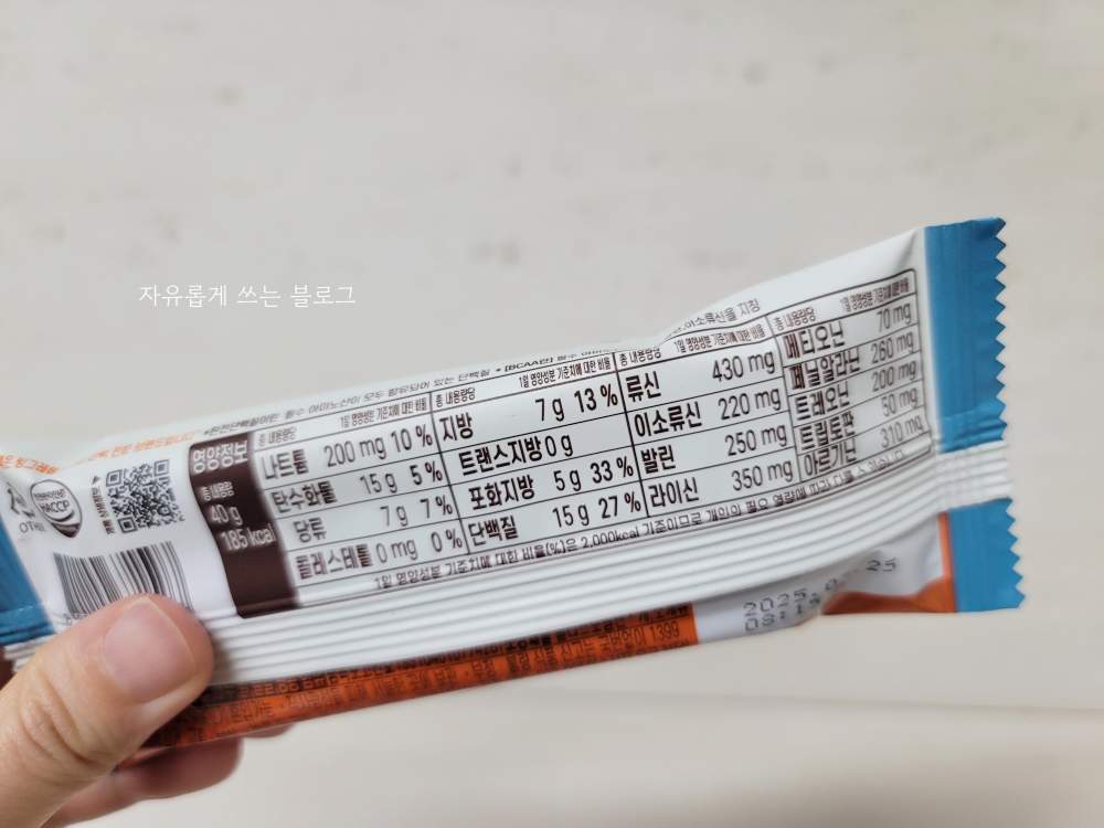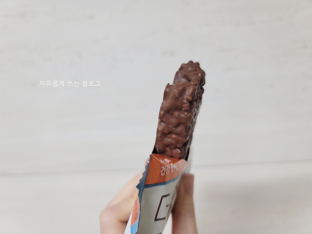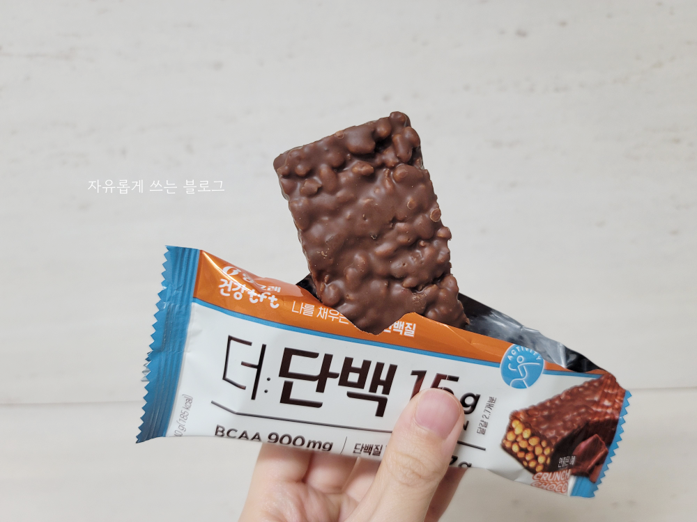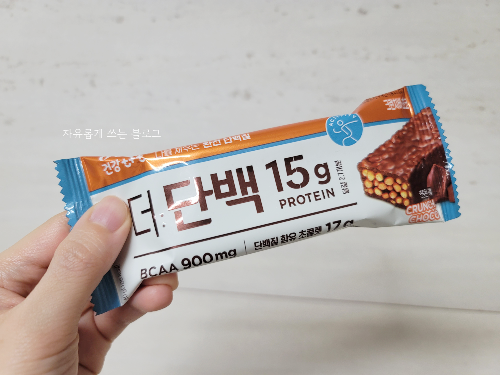 다음은 더단백 크런치바 초코 맛입니다. 마찬가지로 달걀 2.7개분의 단백질이 들어 있다고 해요.
