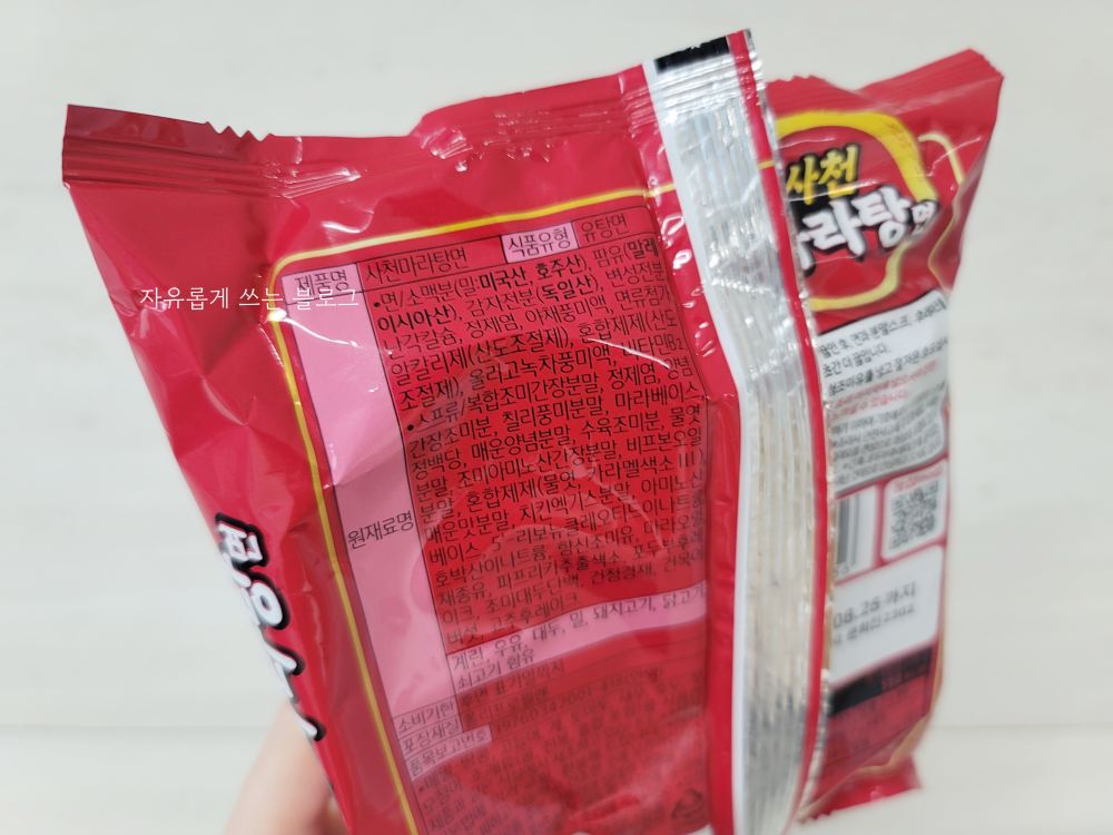원재료명 부분을 살펴보니까 마라베이스, 매운 양념 분말, 매운맛 분말, 고추 후레이크 등등 매운 맛을내는 재료들이 다양하게 들어간 듯 합니다.