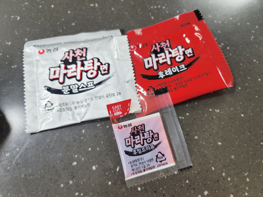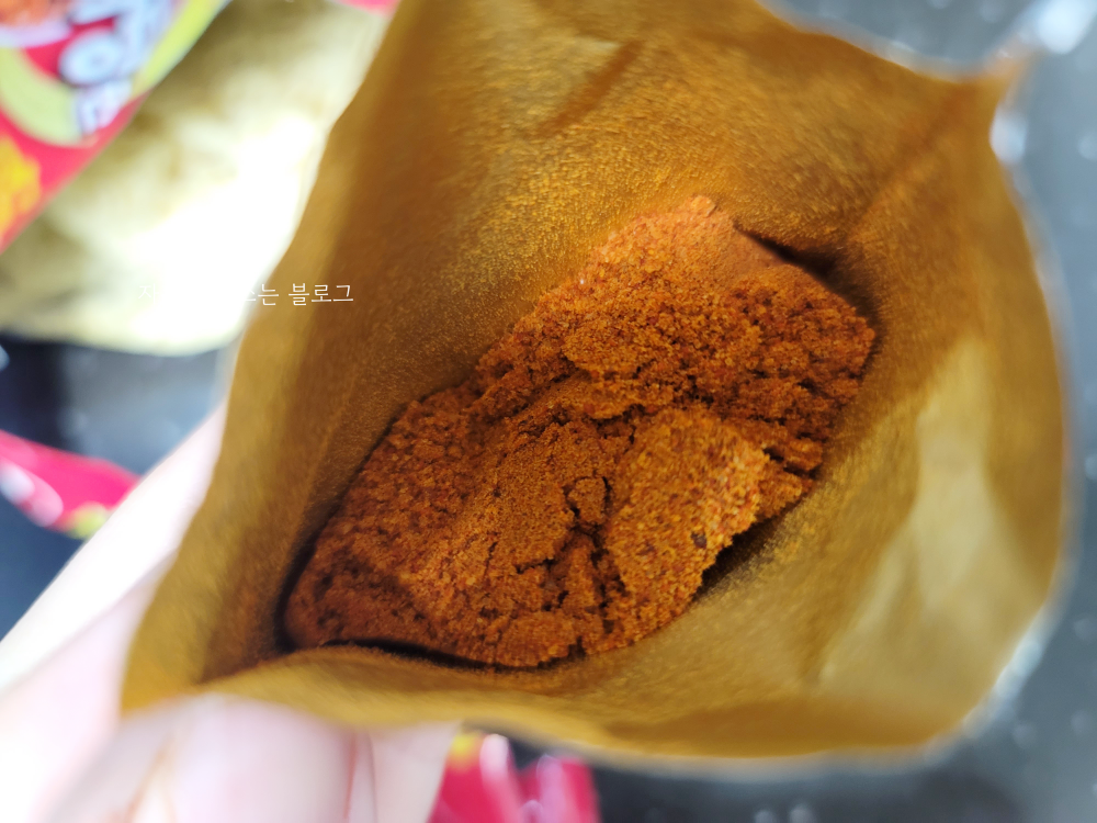 분말 스프는 이런 비주얼입니다. 그냥 보기에는 일반 빨간 국물 라면과 큰 차이가 없어 보이는데, 향을 맡아보면 마라 향이 느껴집니다.