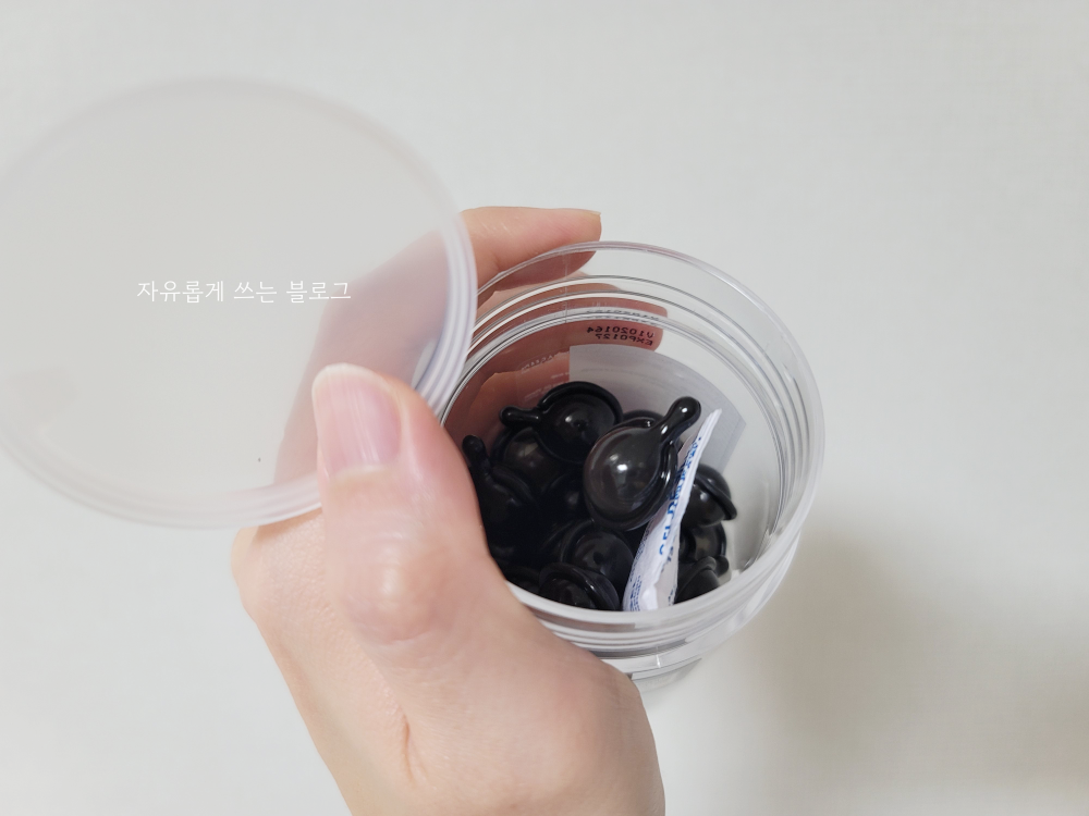 뚜껑을 열면 이렇게 제습제와 함께 헤어오일 캡슐들이 들어 있습니다.